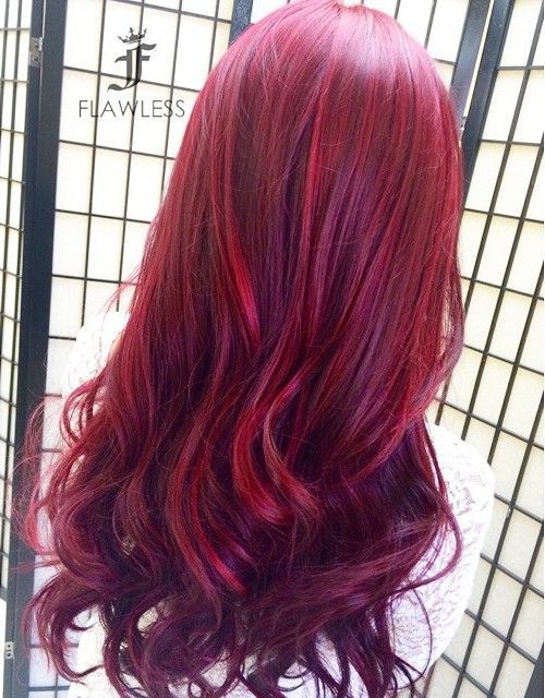 Long, luscious locks similar these are the ideal platform for color melting! A brilliant, look-at-me blood-red on top is subtly toned down with some rich, dark purple ends, a color melt that's intriguing and destined to exist the star of the bear witness.