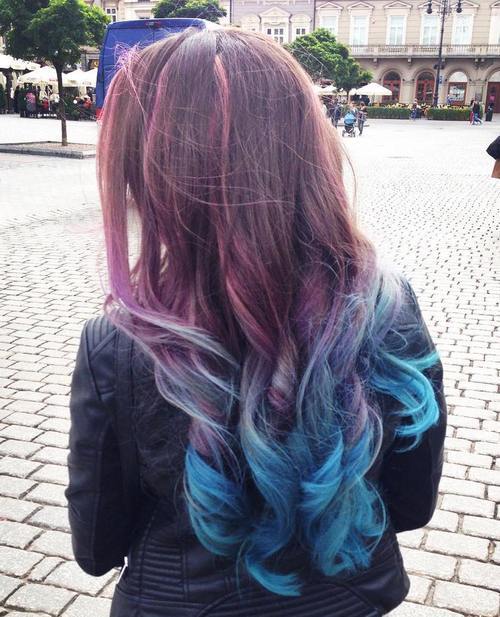 Opposite to the last hairstyle, this mermaid ombre pilus colour showcases a fascinating denim blue shade on the top, leading downwards to a very luscious neon purple. The color dissimilarity is simply divine, especially when enhanced with voluminous ringlets.